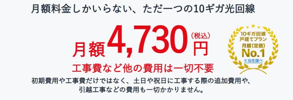 1ギガの光回線サービスでは、マンションなどの集合住宅と戸建て利用では月額料金が異なりますが、10ギガの光回線サービスでは殆どマンション利用と戸建て利用の月額料金は同じに設定されています。戸建て利用する前提で人気の10ギガ光回線サービスの月額料金を見てみましょう。
