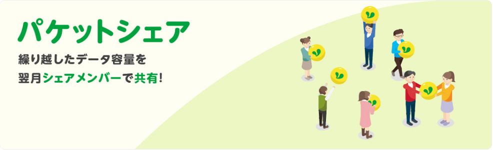 当月中に使い切れなかった基本データ容量やパケットチャージ容量等を翌月に繰り越して、そのパケットを分け合って利用ができる、最大10回線までの家族や友人とグループを組むことができます。