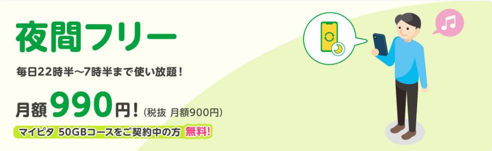 月額990円のオプション「夜間フリー」は、毎日夜22時30分から朝7時30分まで、通信制限無く契約しているギガ容量の消費をすることなく利用することができます。「マイピタ」でも「マイそく」でも利用することができるオプションで、50GBユーザーは無料で利用することができます。(申し込みは必要)