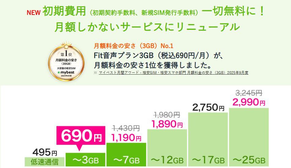 2025年10月より契約時にかかっていた、初期契約手数料と新規SIM発行手数料が無料になりました。
