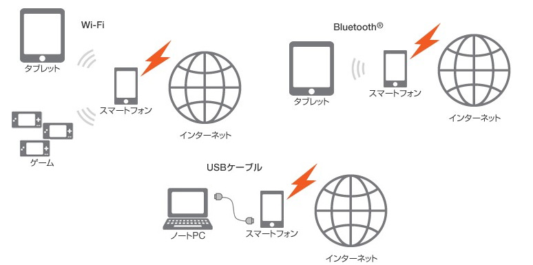 テザリングとは、スマホをインターネット回線の基地局として利用することで、パソコンなどの機器はWi-Fi・Bluetooth・USBで接続します。(*機種によって接続方法の制限があります)