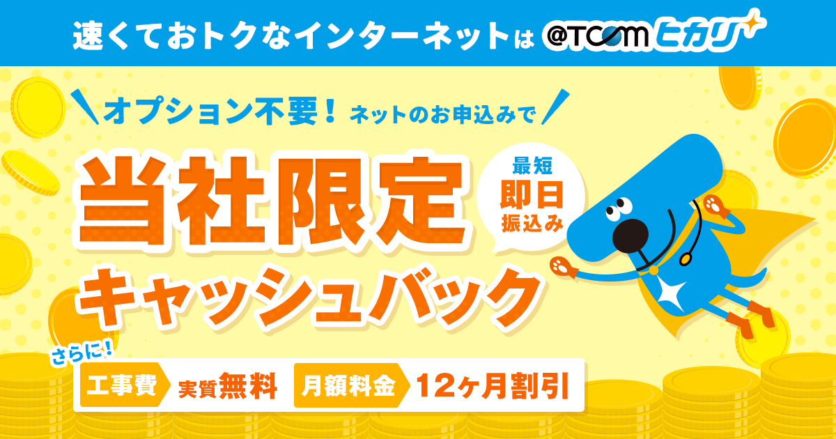 新たに光回線を導入する場合は、本来なら工事費が2万円から3万円程度かかりますが、@TCOMヒカリは工事費無料のキャンペーンを行っている他、キャッシュバックも受け取ることができます。