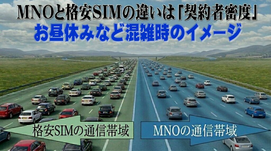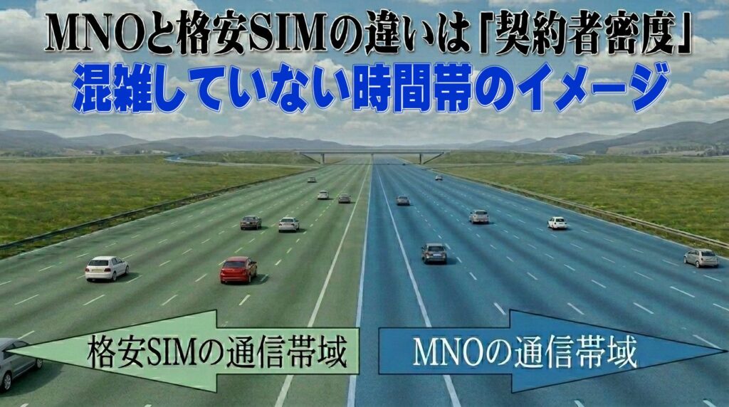 極論ですがたとえば、最低限の細い帯域しか借りていない格安SIMでも、契約して利用するユーザーが一人だけなら、MNOのユーザーよりも快適な通信環境で高速な通信速度が利用できます。